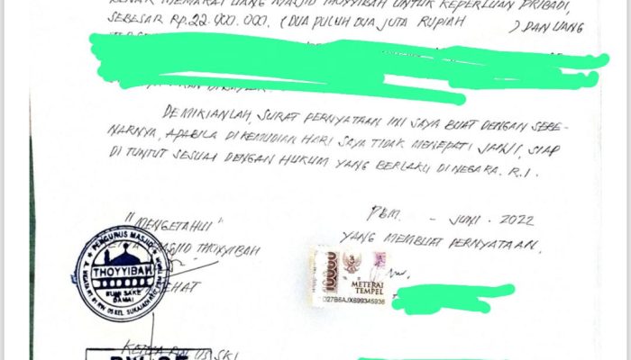 Berdasarkan informasi yang dihimpun, pada bulan Juni 2022 pengurus masjid yang baru bahkan sempat membuat surat pernyataan bersama mantan bendahara tersebut. Dalam surat itu tertulis bahwa uang kas masjid yang diduga telah digunakan berjumlah Rp22.000.000, dan yang bersangkutan berjanji akan mengembalikan secara mencicil.