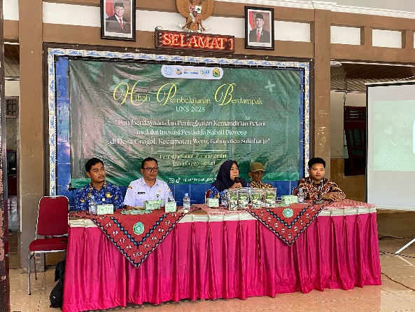 Sambutan berikutnya disampaikan oleh Kepala Desa Grogol, Heri Putut Sugiarto, yang mengapresiasi langkah mahasiswa UNS dalam menghadirkan inovasi yang bermanfaat bagi masyarakat desa. Dukungan serupa juga datang dari perwakilan Camat Weru dan Dinas Pertanian dan Perikanan Kabupaten Sukoharjo, yang menekankan pentingnya sinergi antara akademisi, pemerintah, dan masyarakat untuk mewujudkan pertanian berkelanjutan.