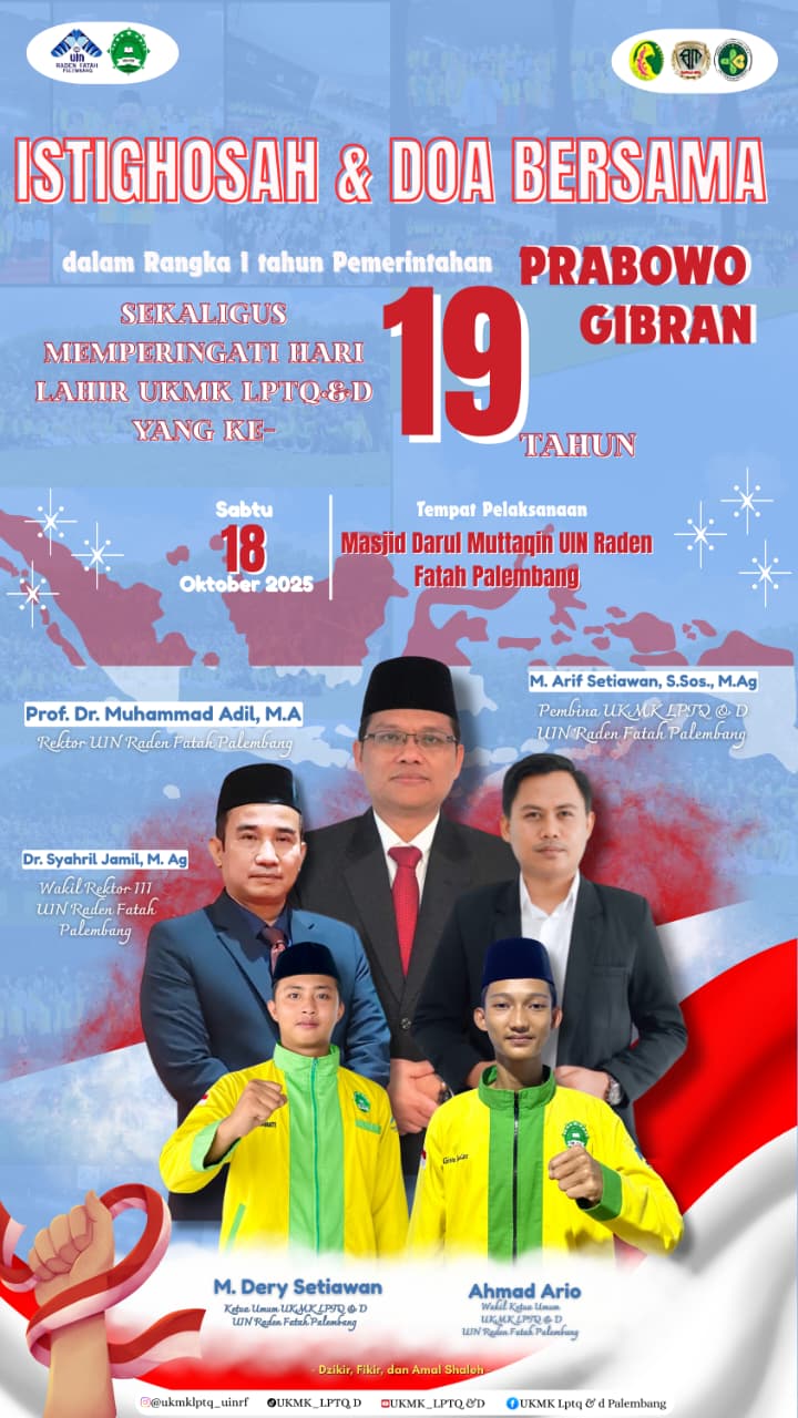 BERITAOPINI.ID PALEMBANG SUMSEL | Unit Kegiatan Mahasiswa khusus (UKMK) Lembaga Pengembangan Tilawatil Qur’an dan Dakwah (LPTQ-D) Universitas Islam Negeri (UIN) Raden Fatah Palembang akan menyelenggarakan kegiatan Istighosah dan Doa Bersama pada hari Sabtu, 18 Oktober 2025. Acara keagamaan ini diadakan dalam rangka ganda, yaitu memperingati Hari Lahir UKM LPTQ-D yang ke-19 tahun sekaligus menyambut 1 tahun Pemerintahan Prabowo-Gibran.