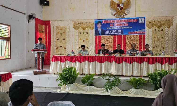 BERITAOPINI.ID PADANG SUMBAR | Anggota Komisi II DPRD Provinsi Sumatera Barat, Ali Muda, SH, melaksanakan Sosialisasi Peraturan Daerah (Perda) Nomor 7 Tahun 2019 tentang Penyelenggaraan Ketenagakerjaan, di Gedung Serbaguna Jorong Bunuik Raya, Nagari Bunuik, Kecamatan Kinali, Kabupaten Pasaman Barat, Jumat (24/10/2025).