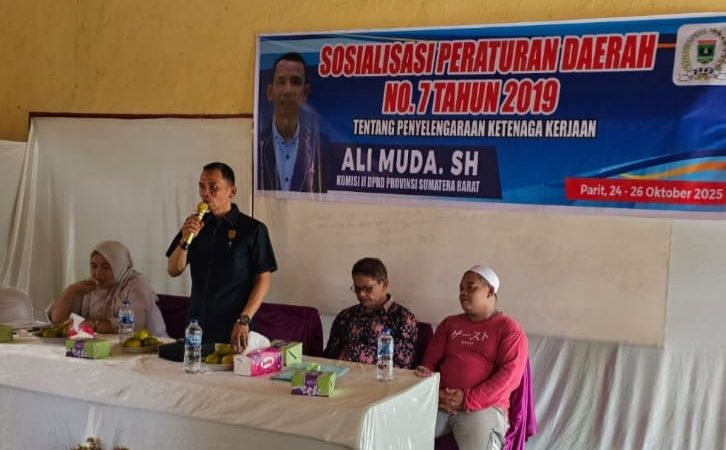 BERITAOPINI.ID PADANG SUMBAR | Anggota Komisi II DPRD Provinsi Sumatera Barat, Ali Muda, SH, melaksanakan kegiatan Sosialisasi Peraturan Daerah (Perda) Nomor 7 Tahun 2019 tentang Penyelenggaraan Ketenagakerjaan, di MDA Jorong Parit, Nagari Parit, Kecamatan Koto Balingka, Kabupaten Pasaman Barat, Minggu (26/10/2025).