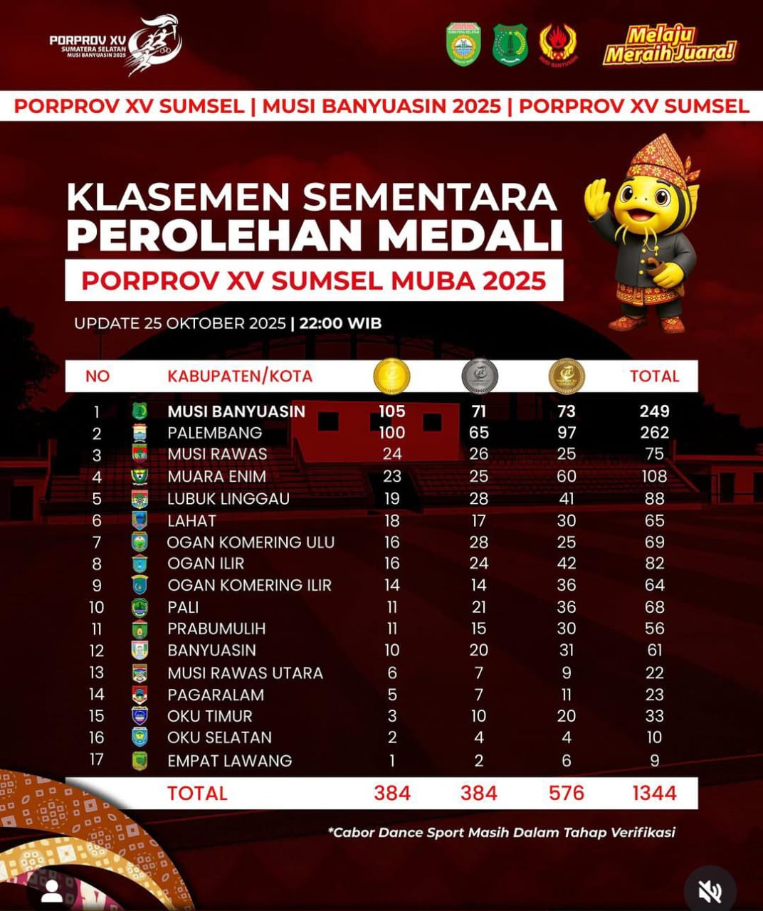 Hingga berita ini diturunkan, Kabupaten PALI berhasil naik ke peringkat 10 klasemen sementara dengan total 68 medali, terdiri dari 11 emas, 21 perak, dan 36 perunggu. Capaian ini menjadi bukti bahwa PALI terus berkembang, semakin diperhitungkan, dan siap bersaing untuk mengukir sejarah baru di Porprov Sumsel XV.