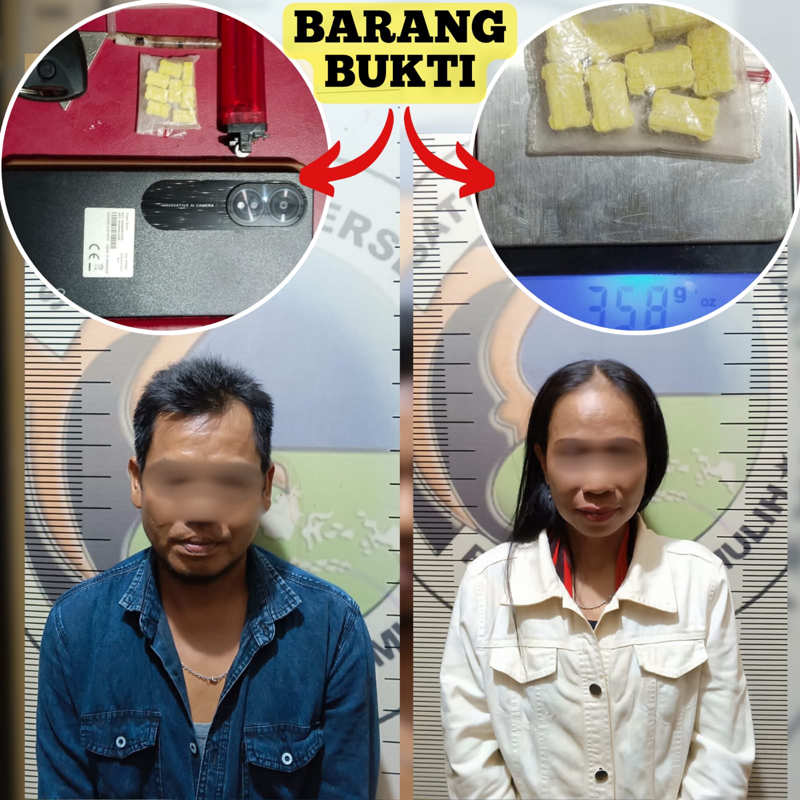 Kasat Resnarkoba IPTU Muhammad Arafah, S.H memerintahkan Kanit Idik II AIPTU Julius Sasmita, S.H bersama anggota untuk mendatangi lokasi. Pada saat dilakukan upaya penindakan, petugas berhasil mengamankan dua pelaku masing-masing Edi Candra Idaman alias Bobot (40), wiraswasta, dan Rusiem alias Mona (43), ibu rumah tangga, keduanya warga Plaju Darat, Kota Palembang.