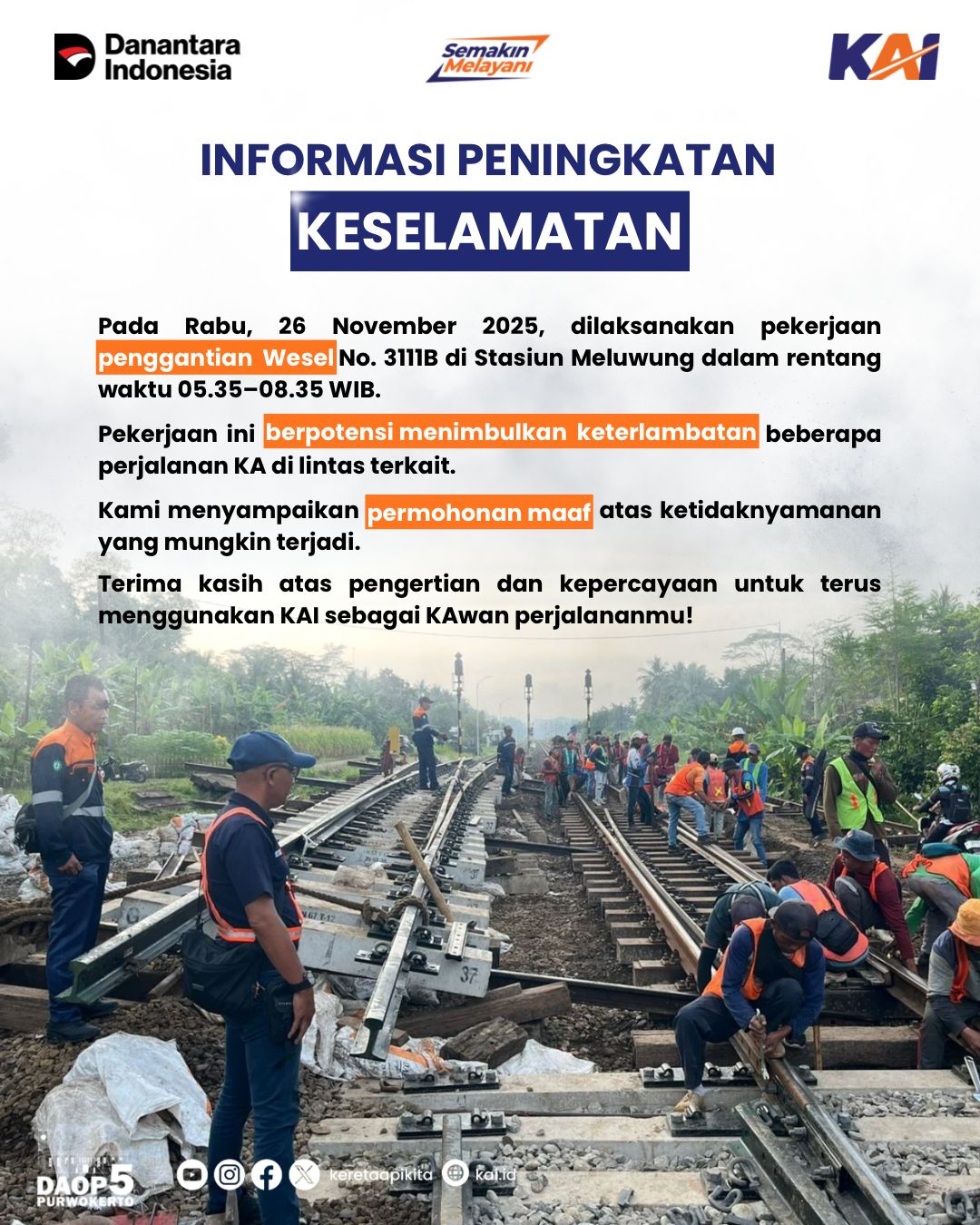 “KAI Daop 5 memastikan bahwa seluruh proses penggantian wesel dilakukan sesuai standar keselamatan. Kami terus mengupayakan agar perjalanan kereta api tetap berjalan lancar, sekaligus menjaga kualitas prasarana demi kenyamanan dan keselamatan pelanggan,” ujar Imanuel Setya Budi Harwanto, Pelaksana Harian Manager Humas KAI Daop 5 Purwokerto, Rabu (26/11/2025), dalam siaran langsung.