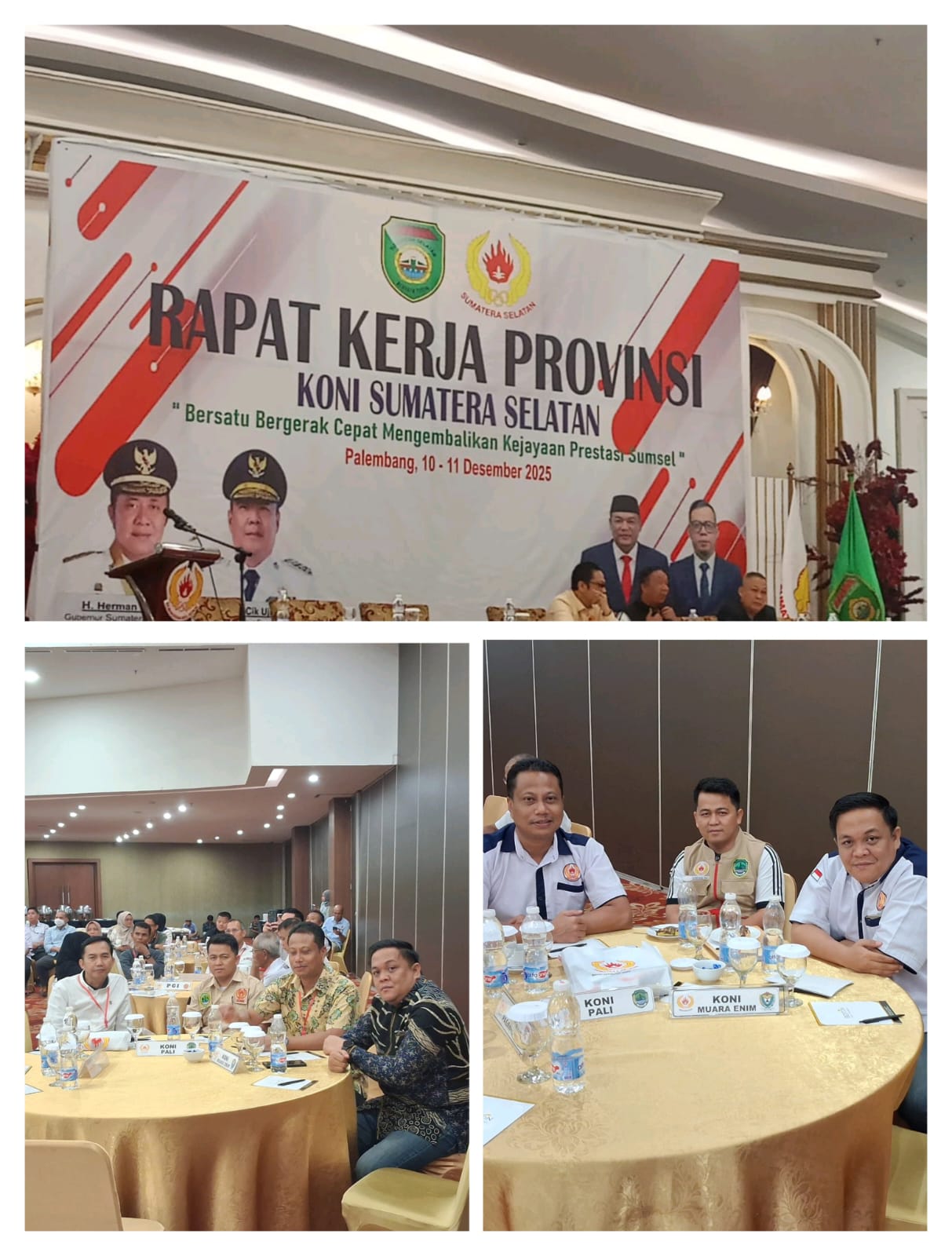 BERITAOPINI.ID PALEMBANG SUMSEL | Komite Olahraga Nasional Indonesia (KONI) Kabupaten Penukal Abab Lematang Ilir (PALI) menghadiri Rapat Kerja Provinsi (Rakerprov) KONI Sumatera Selatan Tahun 2025. Kegiatan berlangsung selama dua hari, 10–11 Desember 2025, bertempat di Ballroom Hotel Beston Palembang dan diikuti oleh delegasi KONI dari 17 Kabupaten/Kota se-Sumatera Selatan.