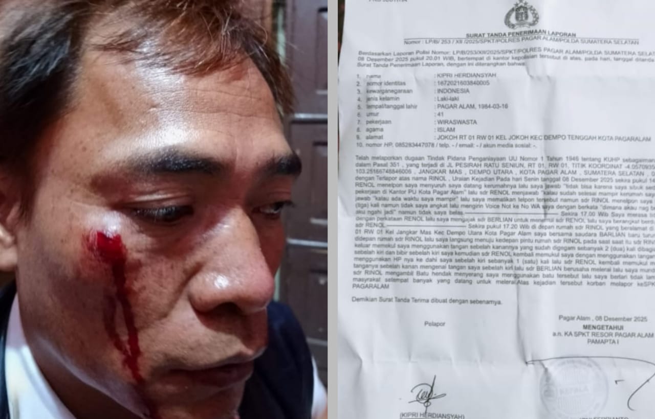 BERITAOPINI.ID PAGAR ALAM SUMSEL | Aksi premanisme berupa pemukulan terhadap wartawan kembali terjadi. Kali ini menimpa seorang wartawan di Kota Pagar Alam bernama Kipri Herdiansyah yang mengalami luka serius di bagian dahi kanan hingga berdarah, dahi kiri lebam dan luka lecet di hidung dan bibir akibat di pukulin oleh pelaku yang merupakan oknum kontraktor di Pagar Alam, Sumatera Selatan, Senin (8/12/25).