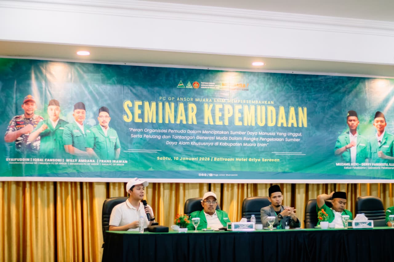 BERITAOPINNI.ID MUARA ENIM SUMSEL | Pimpinan Cabang Gerakan Pemuda (PC GP) Ansor Kabupaten Muara Enim menggelar Seminar Kepemudaan dengan tema “Peran Organisasi Kepemudaan dalam Menciptakan Sumber Daya Manusia yang Unggul serta Peluang dan Tantangan Generasi Muda dalam Rangka Pengelolaan Sumber Daya Alam Khususnya di Kabupaten Muara Enim”. Kegiatan ini dilaksanakan pada Jumat, 10 Januari 2026, bertempat di Ballroom Hotel Griya Serasan Sekundang, Muara Enim.