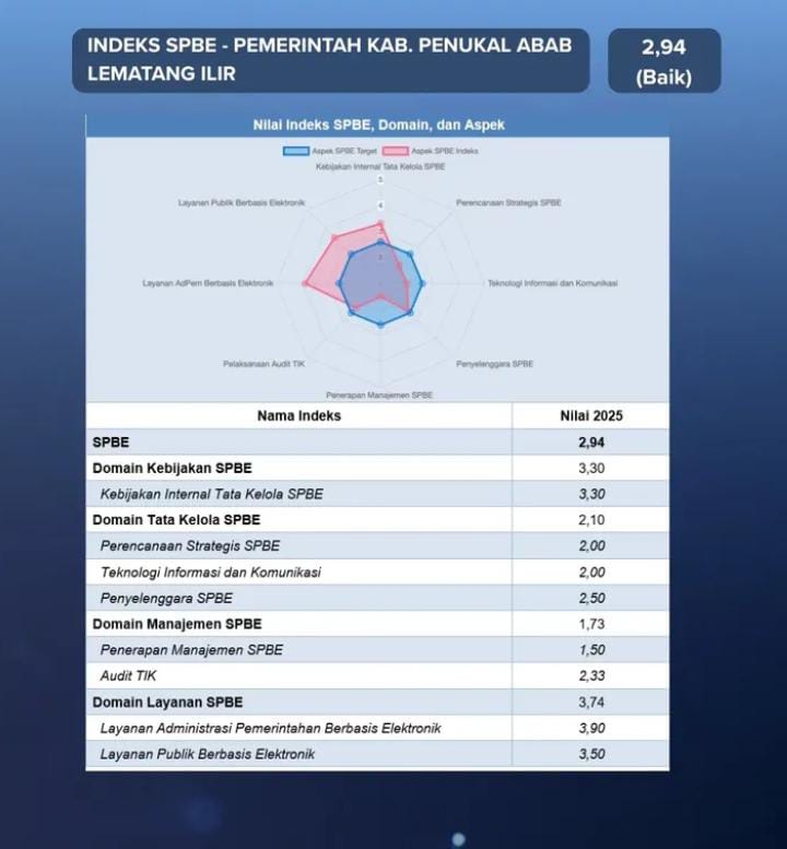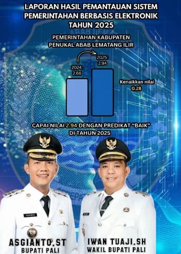 BERITAOPINI.ID PALI SUMSEL | Pemerintah Kabupaten Penukal Abab Lematang Ilir (Pali) mencatat hasil positif dalam Sistem Pemerintahan Berbasis Elektronik (SPBE) tahun 2025, dengan nilai indeks keseluruhan 2,94 dan predikat “BAIK”. Data rinci menunjukkan kinerja unggul pada beberapa domain, di mana Domain Layanan SPBE menjadi yang tertinggi dengan nilai 3,74.