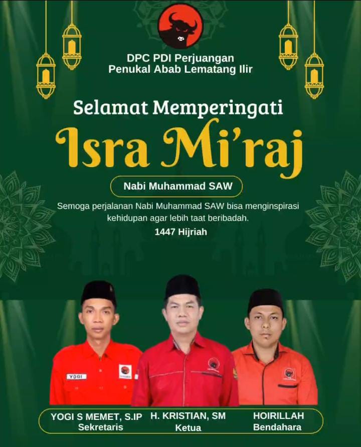 BERITAOPINI.ID PALI SUMSEL | Dewan Pimpinan Cabang (DPC) Partai Demokrasi Indonesia Perjuangan (PDIP) Kabupaten Penukal Abab Lematang Ilir (PALI) mengucapkan Selamat memperingati Isra Mi’raj Tahun 1447 Hijiriah, Jum’at 16 Januari 2026.