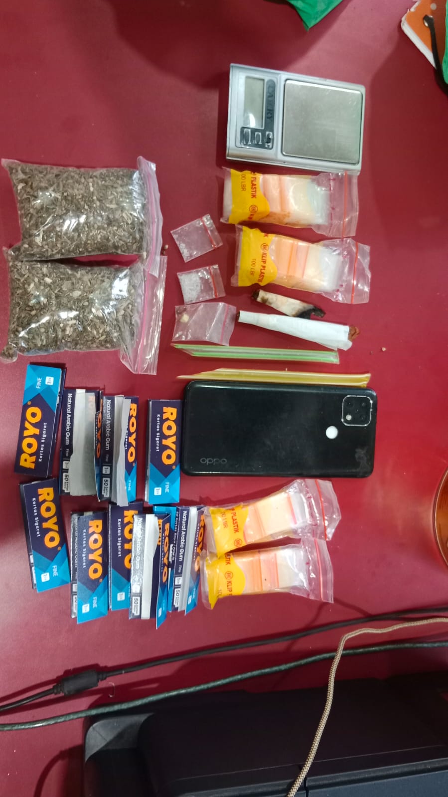 Dalam penggerebekan tersebut, polisi berhasil mengamankan sejumlah barang bukti narkotika, di antaranya dua kantong besar ganja dengan berat total 86,14 gram, satu linting ganja siap isap seberat 3,33 gram, ganja kering seberat 7,54 gram, narkotika jenis ekstasi seberat 0,35 gram, serta sabu dengan total berat 0,61 gram. Selain itu, turut diamankan timbangan digital, bal klip bening, telepon genggam, serta perlengkapan lain yang diduga digunakan untuk aktivitas peredaran narkoba.