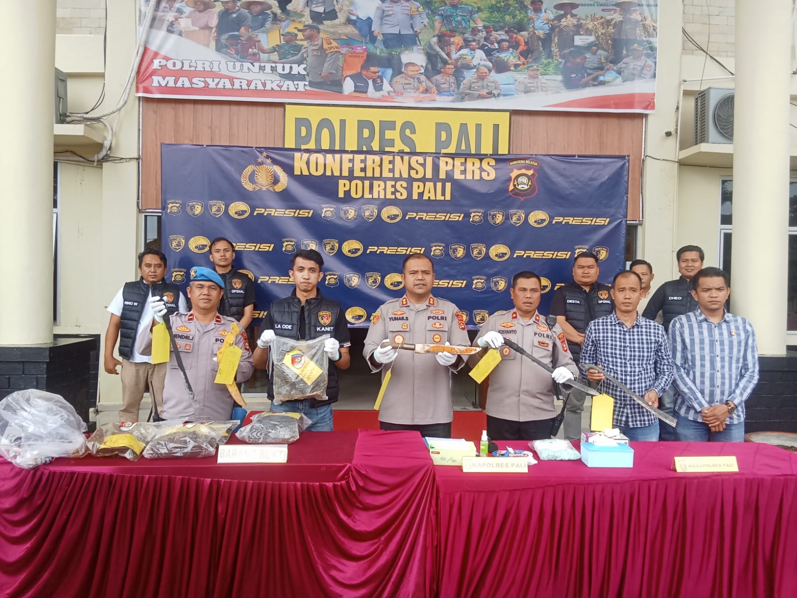 AKBP Yunar Hotma Parulian Sirait, S.H., S.I.K., M.I.K, Kapolres kab Pali didampingi Wakapolres, memberikan keterangan bahwa Kepolisian Resort, telah berhasil mengamankan Dua (2) tersangka, terkait dua korban ditemukan di kebun sawit Desa Sungai Ibul Kecamatan Talang Ubi.