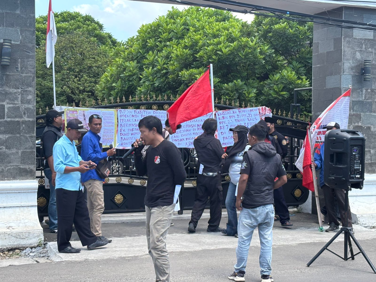 Beberapa spanduk yang terlihat di antaranya bertuliskan: “BPJN Banten diduga menjadi penampung pelaksana/perusahaan bermasalah pada kinerjanya ex daftar hitam, tersandung hukum di KPK RI. Banten bukan penampung kontraktor bermasalah hukum”, “PT. Duta Mas Indah adalah perusahaan ex bermasalah pada pekerjaan di Provinsi lain, diduga tersandung tindak pidana korupsi di KPK RI”, serta “Anggaran pemeliharaan rutin PPK 21, PPK 22, PPK 23 tahun 2025 Rp7 miliar lebih diduga dikorupsi pada pengerjaannya mengurangi spek”.