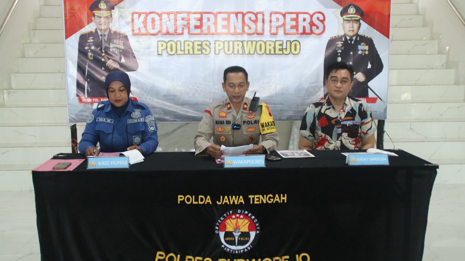 Konferensi pers tersebut dipimpin oleh Wakapolres Purworejo Kompol Nana Edi Sugito, S.H. didampingi Kasat Resnarkoba AKP Amiruddin Zulkarnain, S.H. serta Kasi Humas Polres Purworejo AKP Ida Widaastuti, S.H., M.A.P.